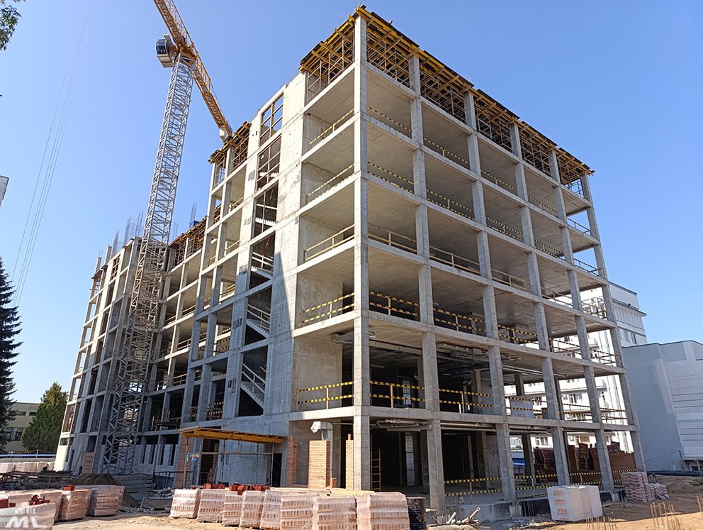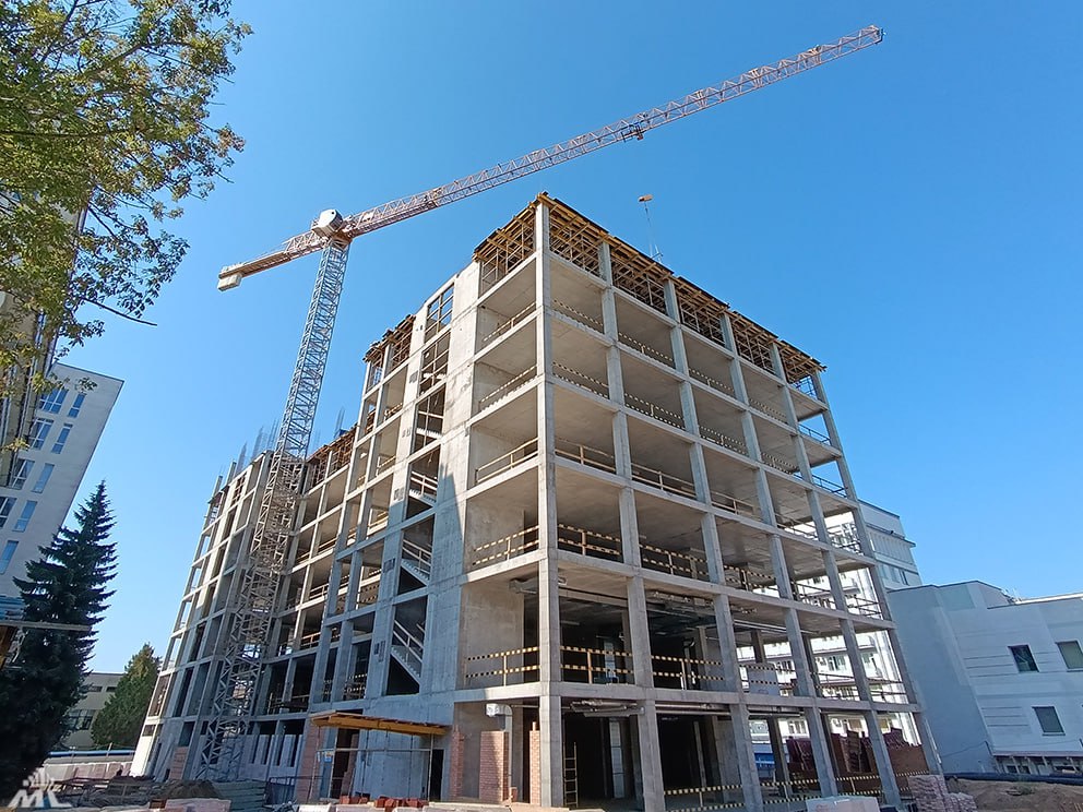 Новый корпус Минского онкологического центра на проспекте Независимости, 64 активно строится. Рабочие генподрядчика СУ-19 уже завершили перекрытие седьмого этажа. По плану последний, восьмой этаж будет возведен до конца текущего месяца.