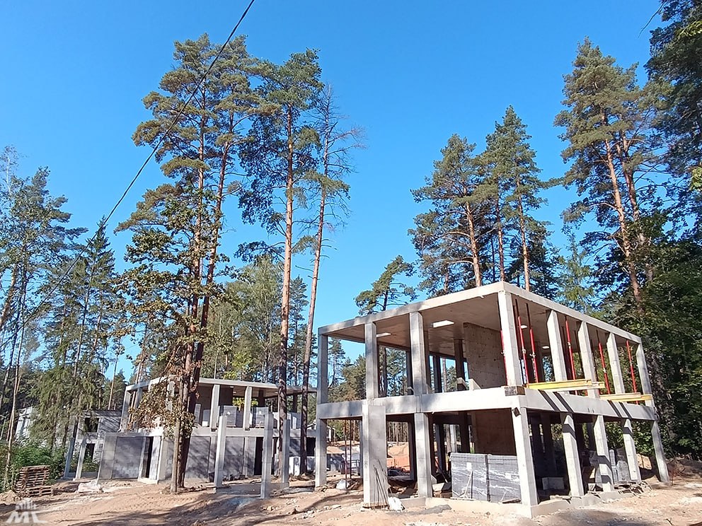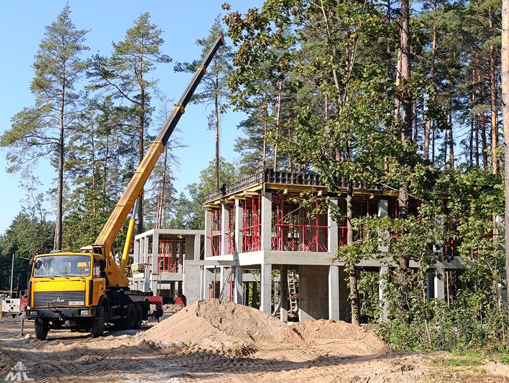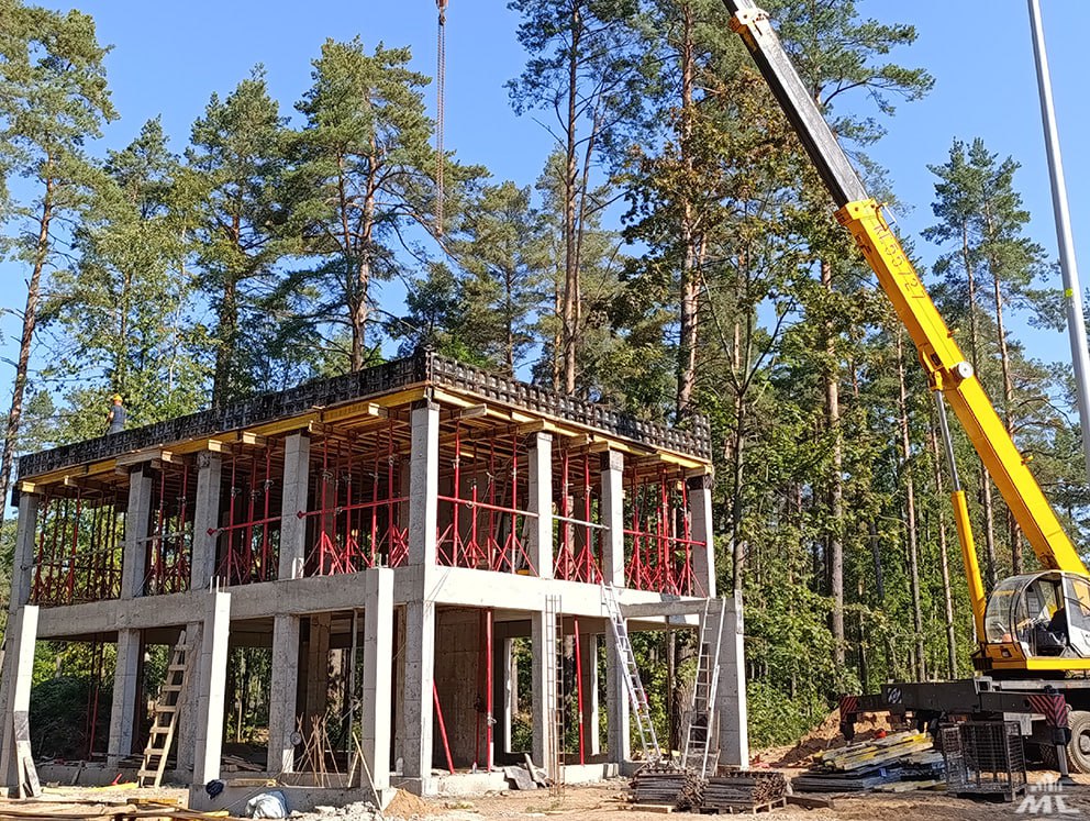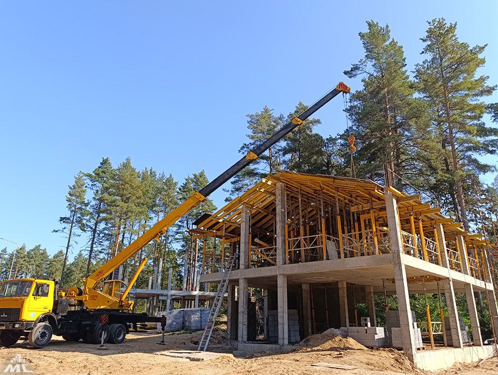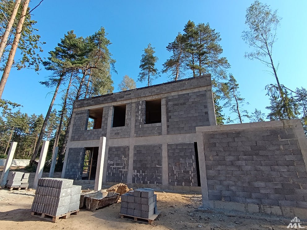 В настоящее время на строительной площадке ведутся работы по монолитному каркасу, устройству стен и перегородок из керамзитобетонных блоков, а также монтажу стропильных систем и кровли из легких стальных тонкостенных конструкций (ЛСТК).