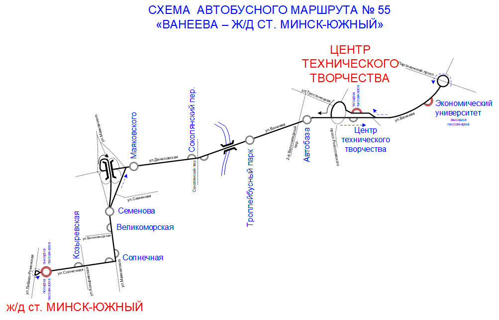 Кроме того, городскому автобусному маршруту № 55 «АВ Восточный – ж/д ст. Минск-Южный» присваивается новое наименование «Ванеева – ж/д ст. Минск-Южный».