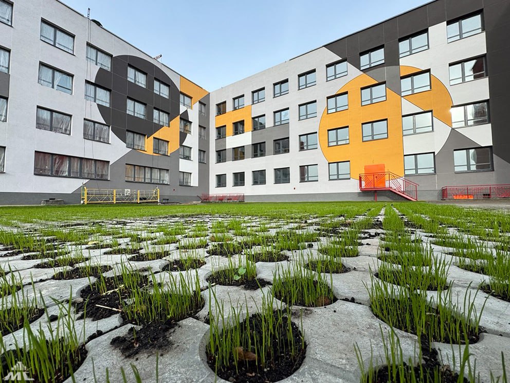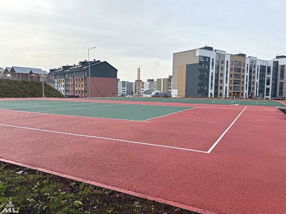 Рядом со школой большой спортивный комплекс. Работы не завершены, но уже понятно по разметке, где будут площадки для волейбола, баскетбола, мини-футбола, беговые дорожки... Вымощены плиткой пешеходные связи, уложены специальные покрытия для занятий спортом. Очень симпатично смотрится плитка с внутренним газоном – этакий баланс эстетики и экологии.