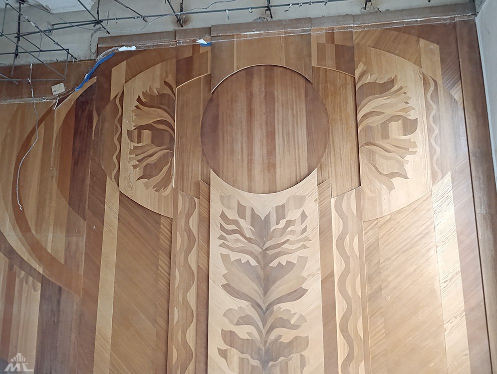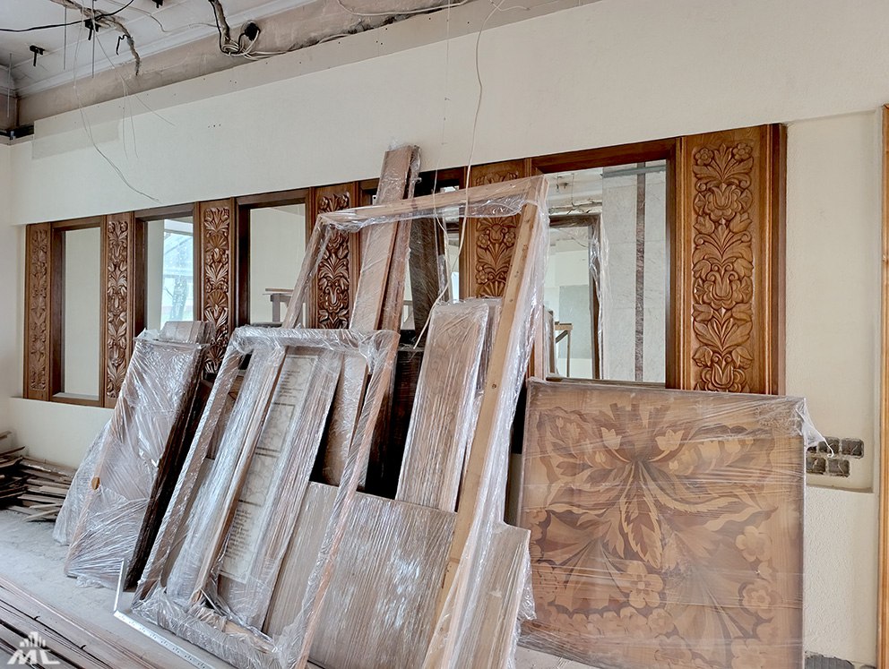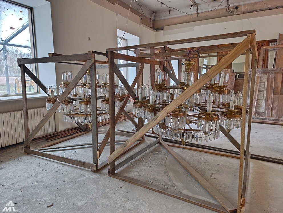 Три большие люстры упакованы к отправке на реставрацию. Как и деревянные двери с резными элементами, зашивки радиаторов, зеркала в декоративных рамах и пр. Они уедут в мастерские, а декоративные панно отреставрируют на месте.