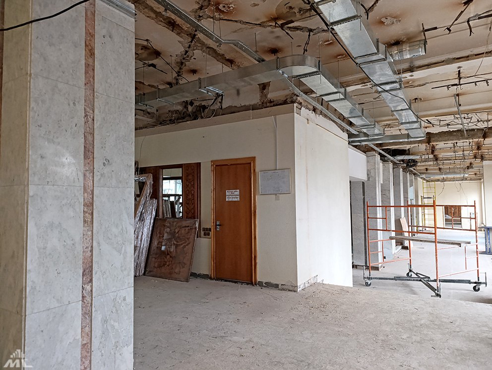 Паркетные полы в залах торжеств отшлифуют и покроют лаком – пока их защитили укрывочным материалом. В фойе левого крыла будет новый пол из керамогранита.