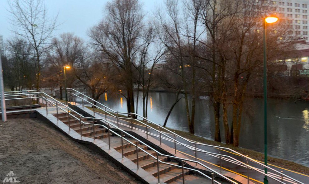 Проектировщики из «Брестжилпроекта» удачно интегрировали здание в ландшафт набережной. Комплекс органично вписался в среду с эффектным спуском к воде и велодорожкам, создавая ощущение, что он был здесь всегда.