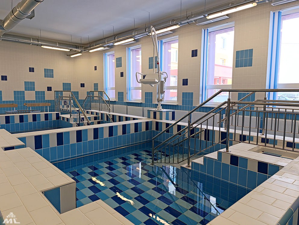 Особой гордостью учреждения стала аквазона с тремя бассейнами: одним большим и двумя для самых маленьких посетителей. Всё пространство поликлиники адаптировано для безбарьерного доступа.