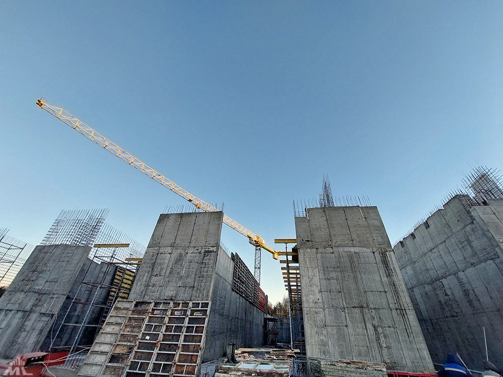 В составе корпуса – два АБК. На первом готова кладка первого этажа. На втором – один уже перекрыт. Каменщики заходят на второй этаж.